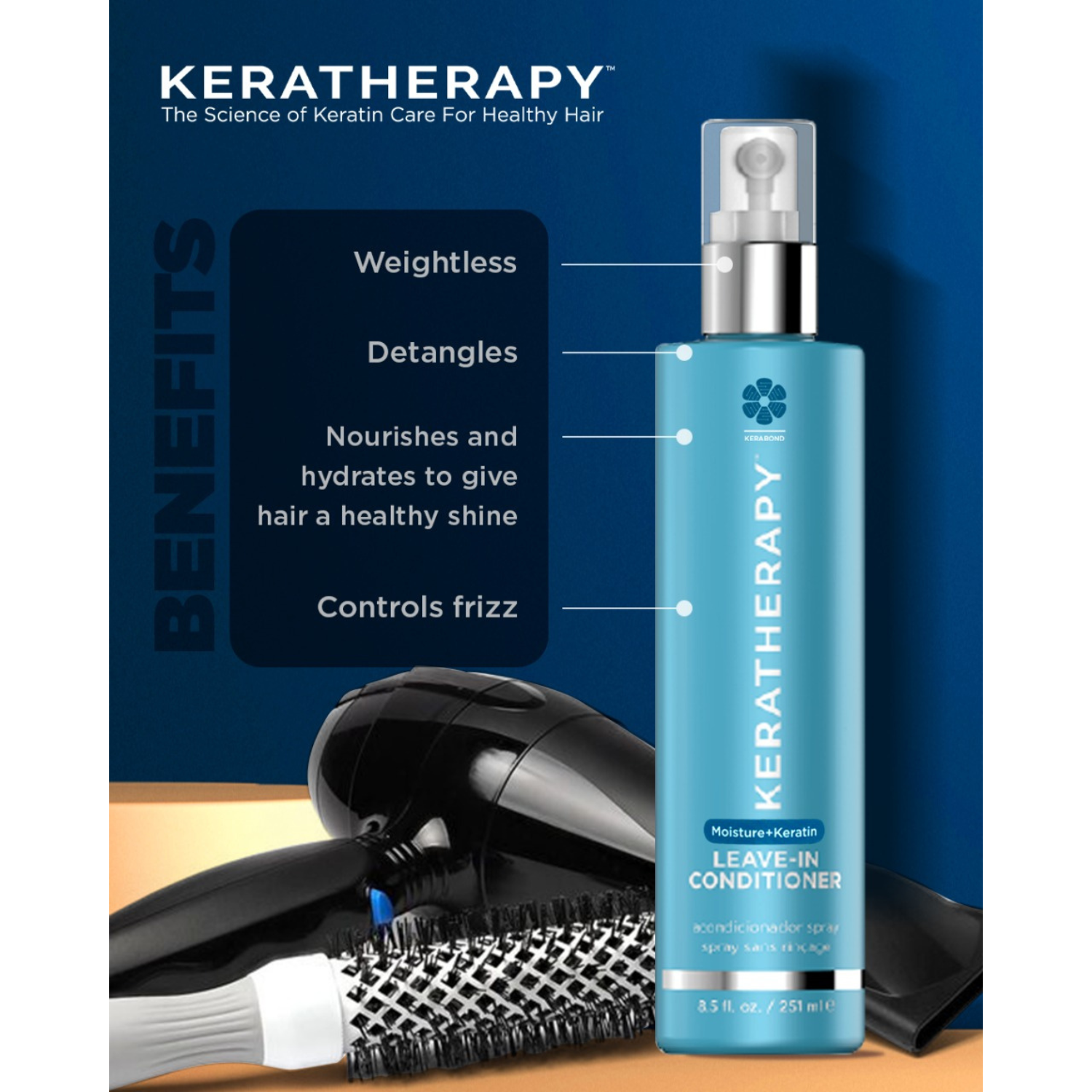 - Un spray revitalisant sans rinçage à la kératine qui protège vos cheveux pendant le coiffage ou même la baignade.